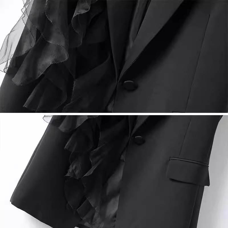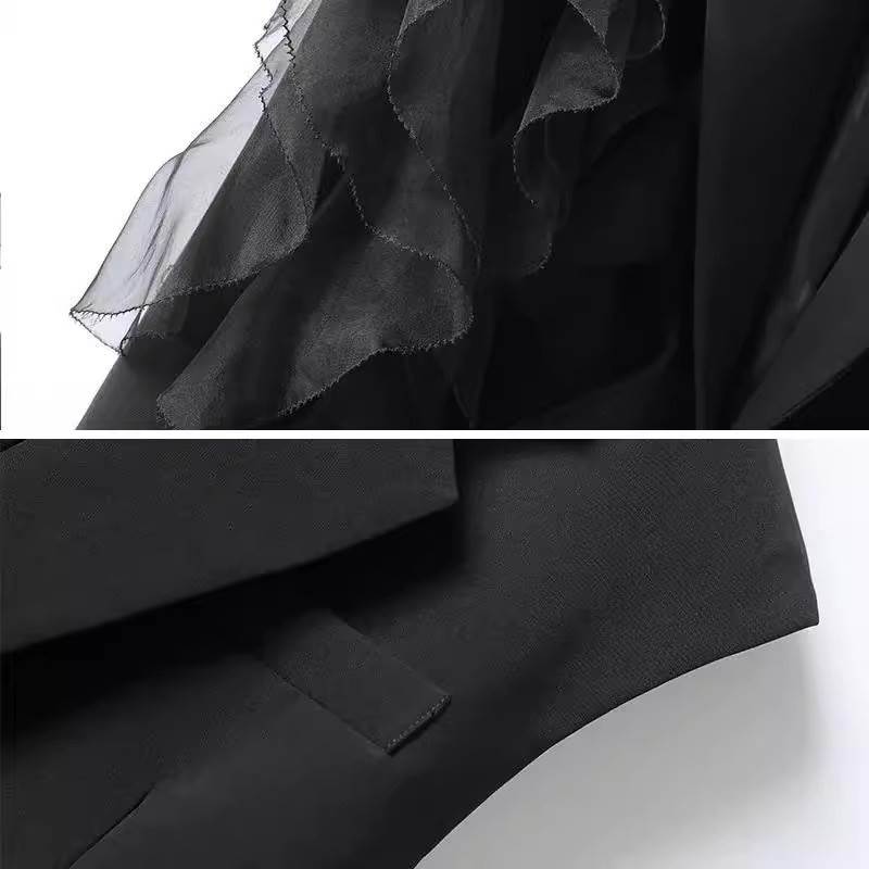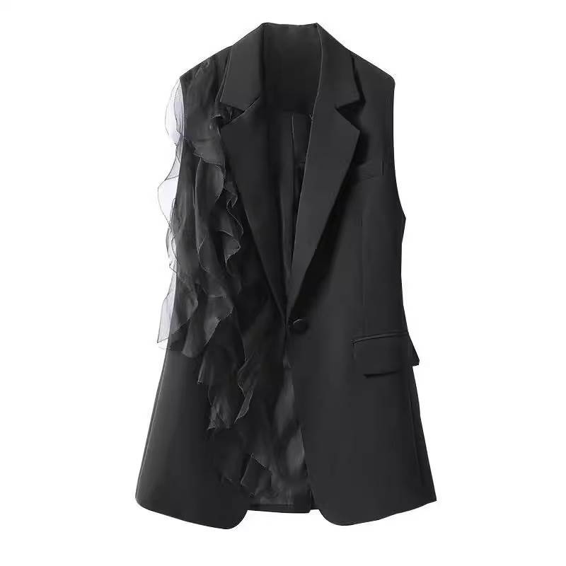 アウター トップス ジレ ベスト レディース ロング フリル 袖なし ノースリーブ 黒 ブラック Vネック 襟付き アシンメトリー 春 夏 秋 個性的 フェミニン 前開き 異素材 かわいい 大人