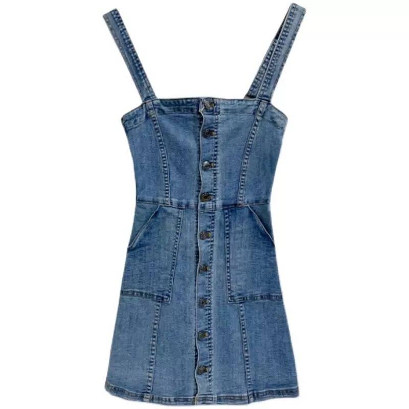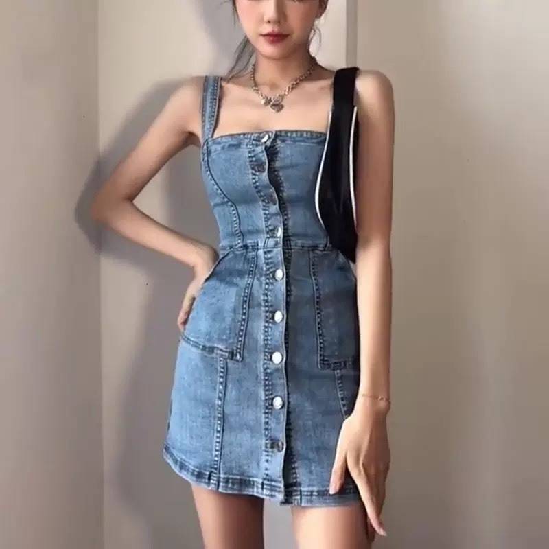 ワンピース レディース デニム キャミソール ワンピ サロペット ミニ ショート 春 夏 スリム タイト ボタン 無地 ブルー 休日 お出かけ デート ファッション 女子会