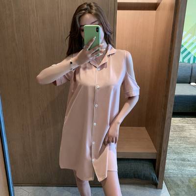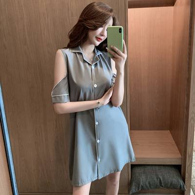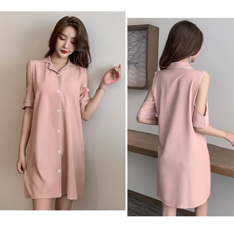 シャツワンピース 夏 レディース パジャマワンピ 5分袖 肩出し Vネック ミニ丈 膝上 無地 10代 20代 30代 40代ママ お泊り 休日 ルームウエア パジャマ ナ