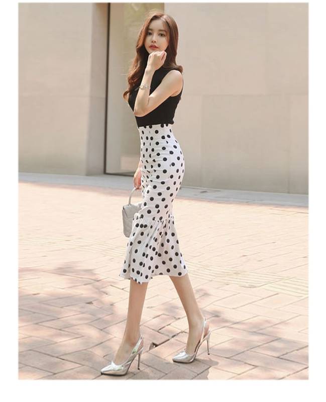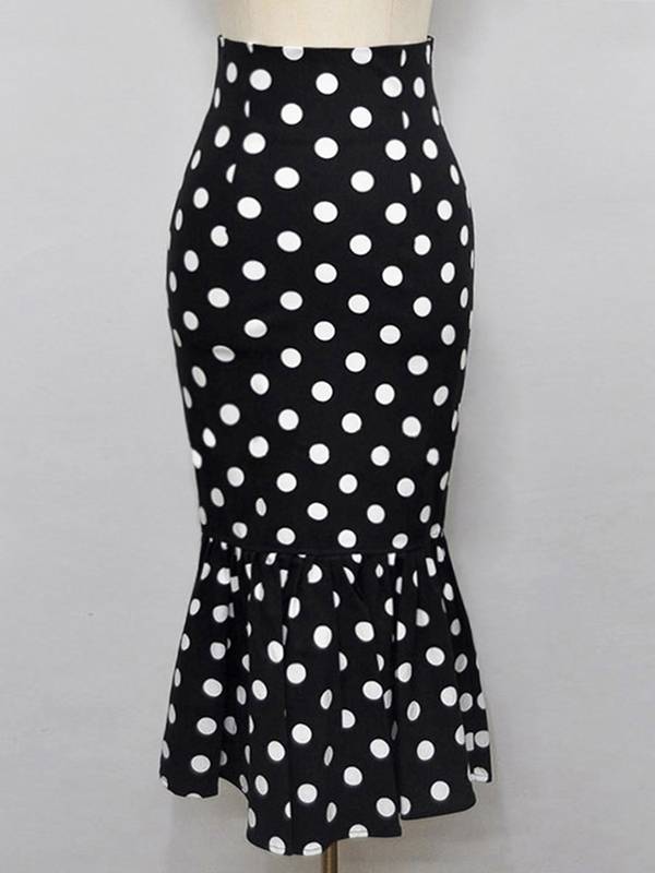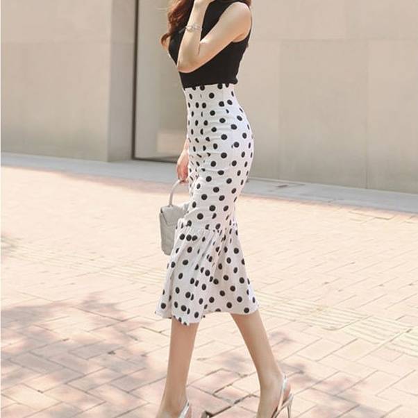 スカート レディース マーメイド ミモレ丈 春 夏 ドット柄 水玉 ブラック ホワイト 2色展開 フレア タイト ハイウエスト 休日 お出かけ デート コーデ 女子会 普段使