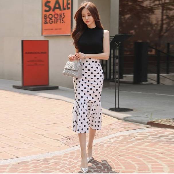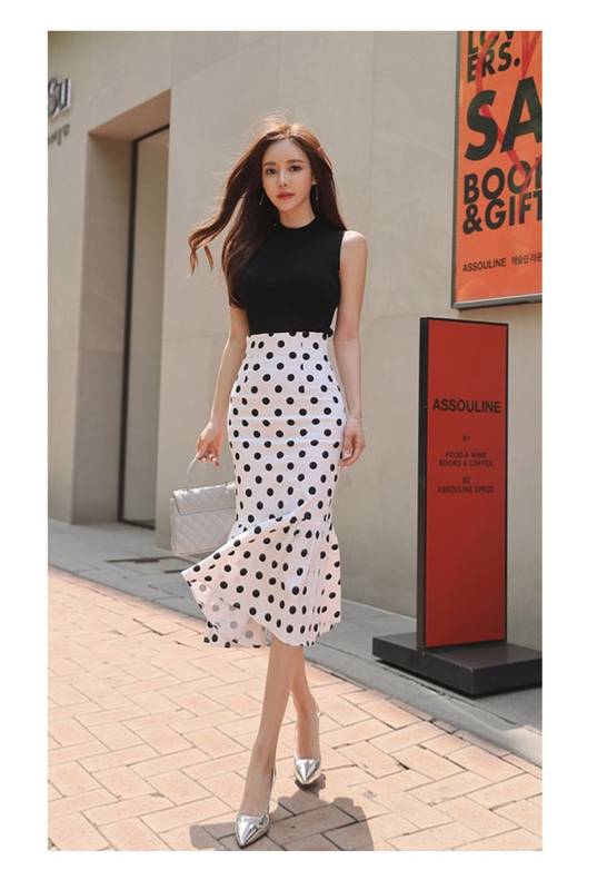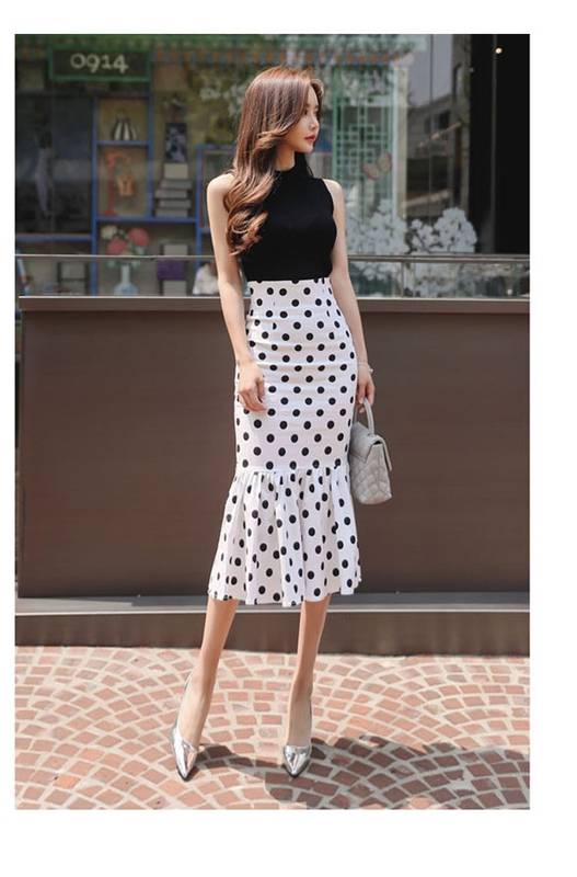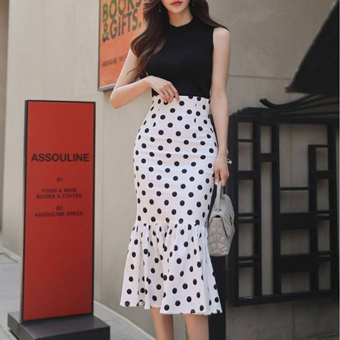 スカート レディース ドット柄 マーメイドスカート マーメイド タイト 裾フレア ボトムス ハイエスト おしゃれ タイト タイトスカート シック 大人カジュアル 大人かわいい 大人かっこいい 着まわし パーティー コーデ こなれ感 ラフ 女っぽ かっこいい クール デート ブラック 黒 ホワイト 白 10代 20代 30代 春 夏 トレンド 脚長 スタイルアップ 韓国 ファッション 存在感 体型カバー リゾート 旅行 メンズライク スタイル XS S M L XL