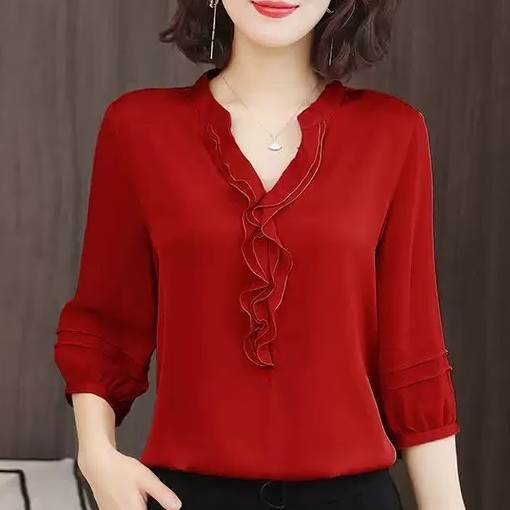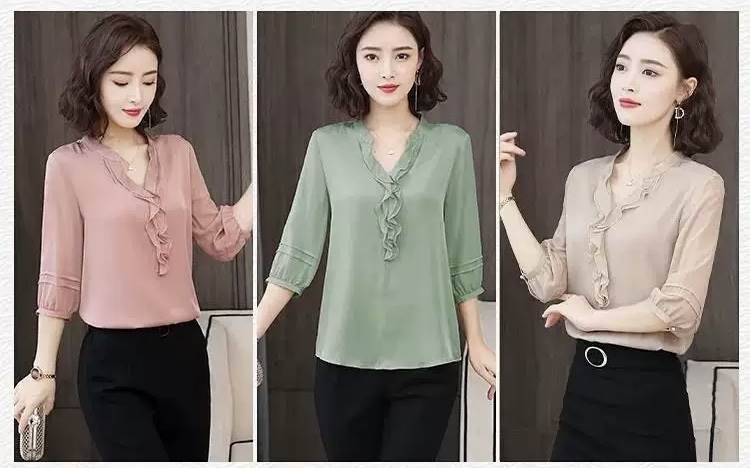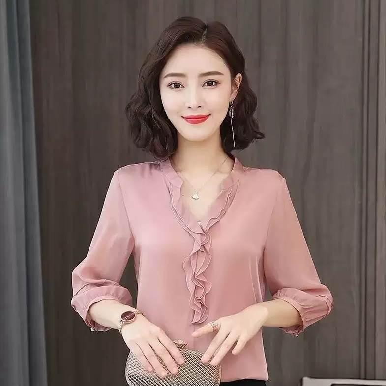 トップス レディース シャツ ブラウス 七分袖 Vネック 襟付き シフォン フリル 大人 可愛い きれいめ 上品 お洒落 個性的 エレガント 主役級 無地 春 夏 秋 ピンク