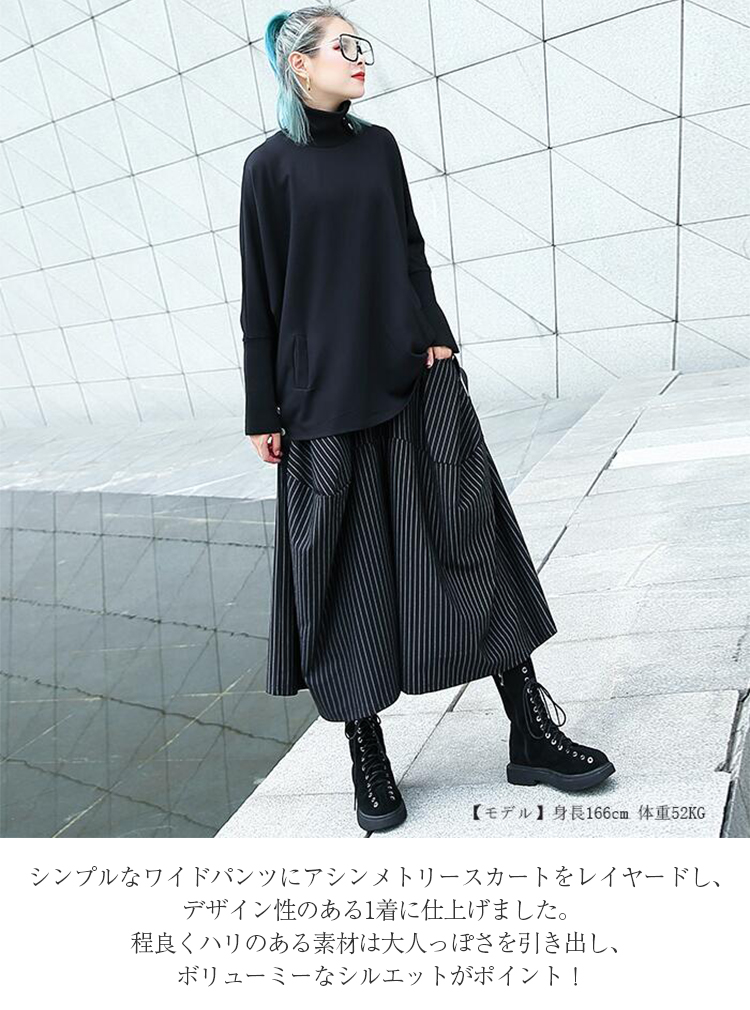 アシンメトリーなストライプ柄スカート風ドレープワイドパンツです。