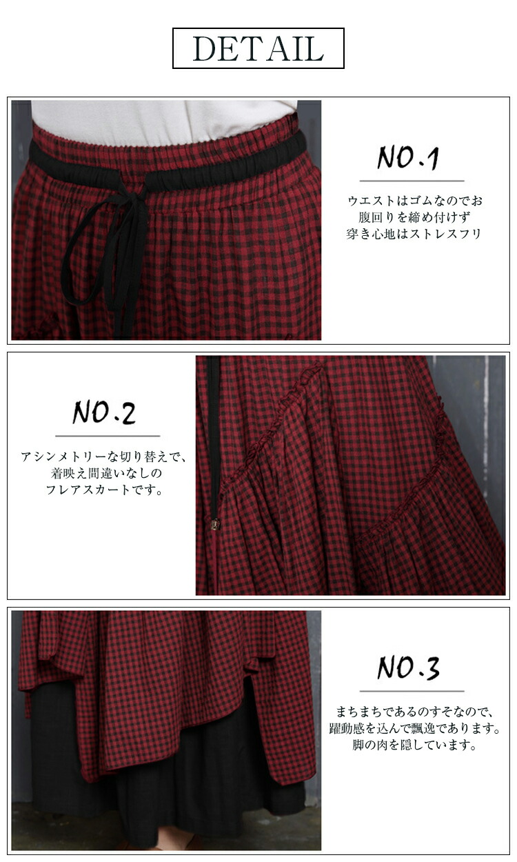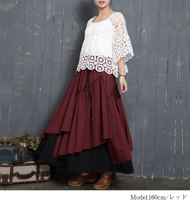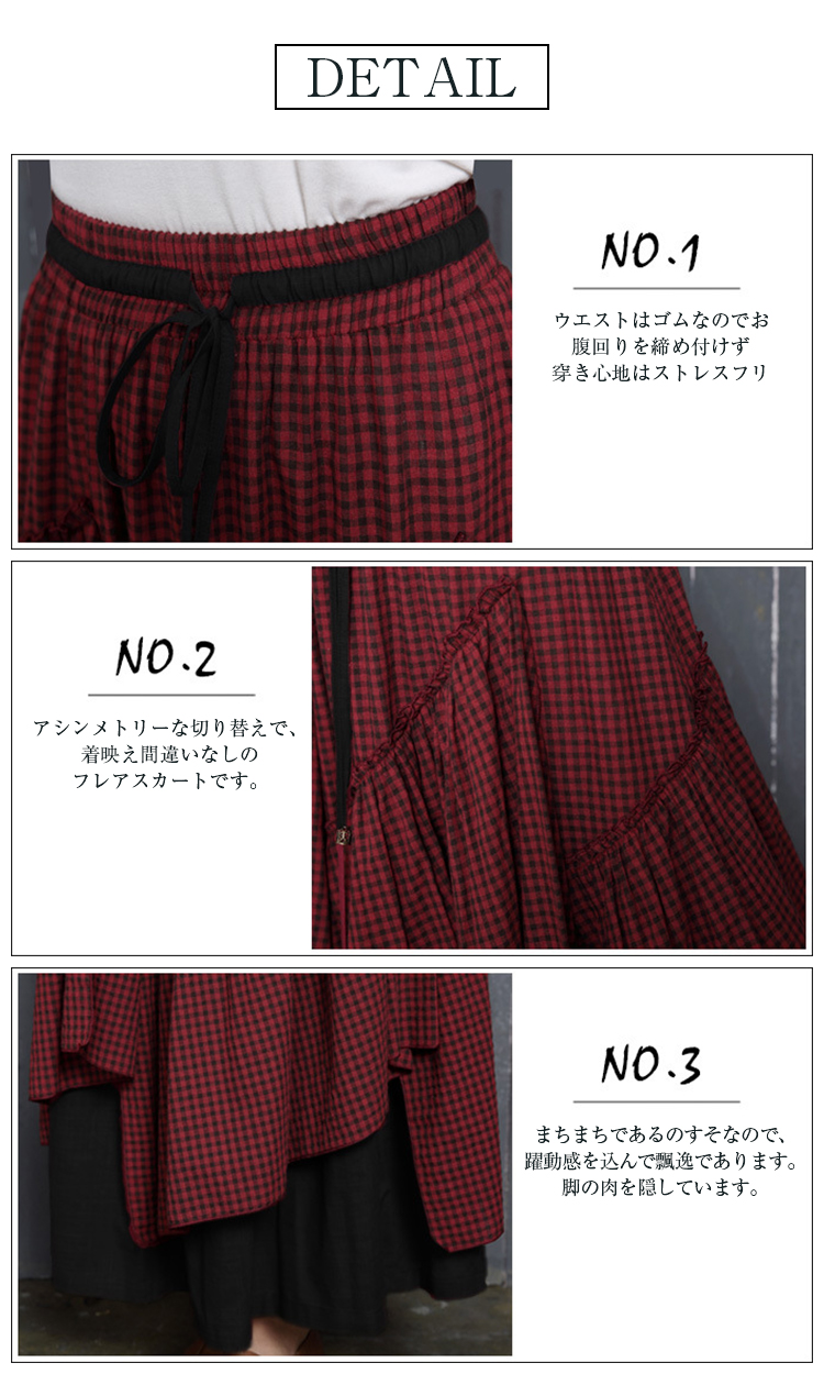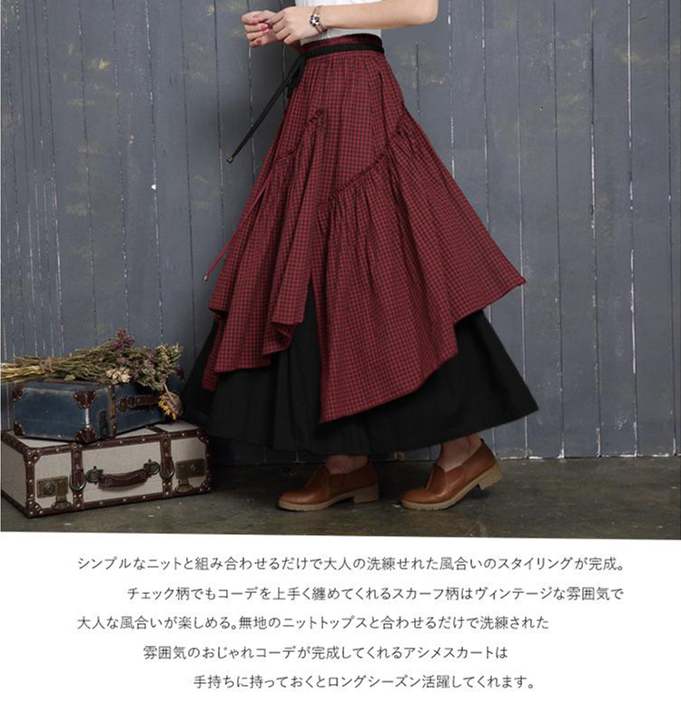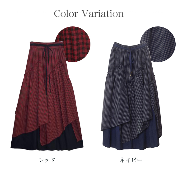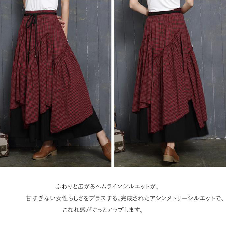アシンメトリー チェック柄 スカート レディース 春 夏 ロングスカート 変形スカート 綿100% スカート マキシ丈 フレアスカート ボトムス チェック柄 ヘムライン ウエストゴム アレンジ 調節