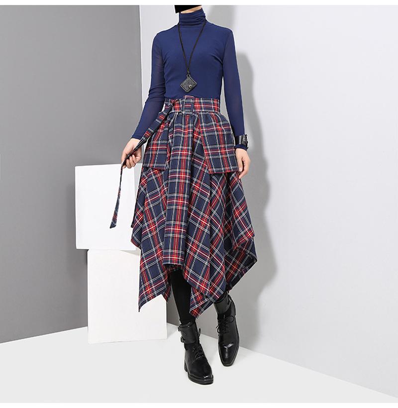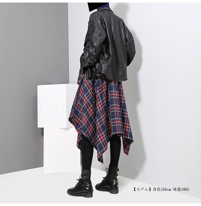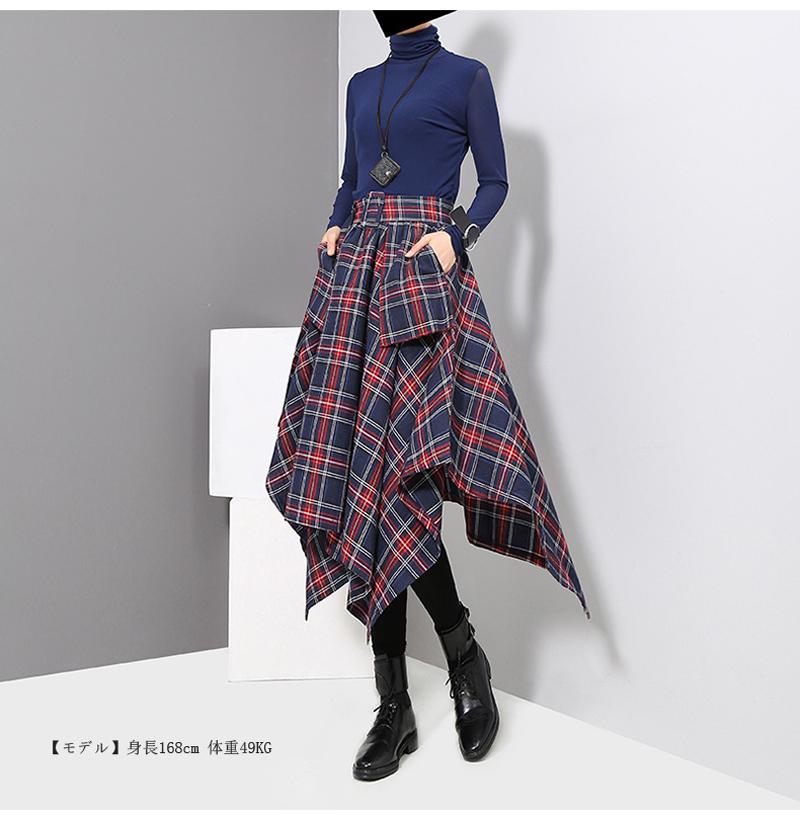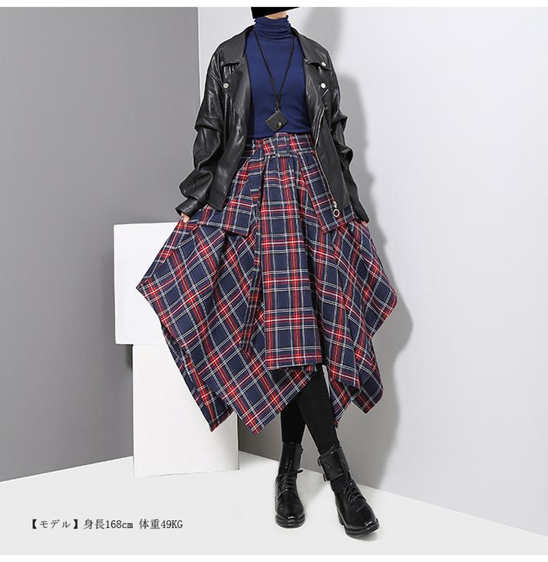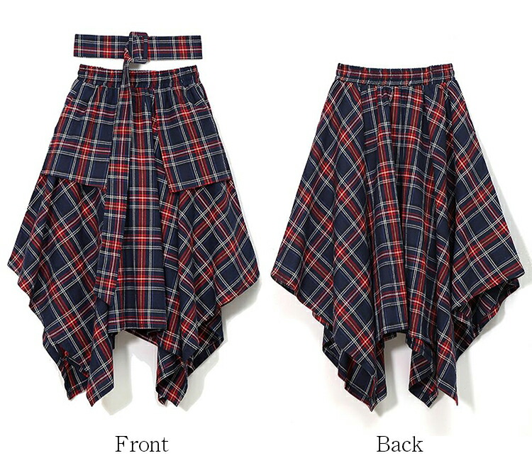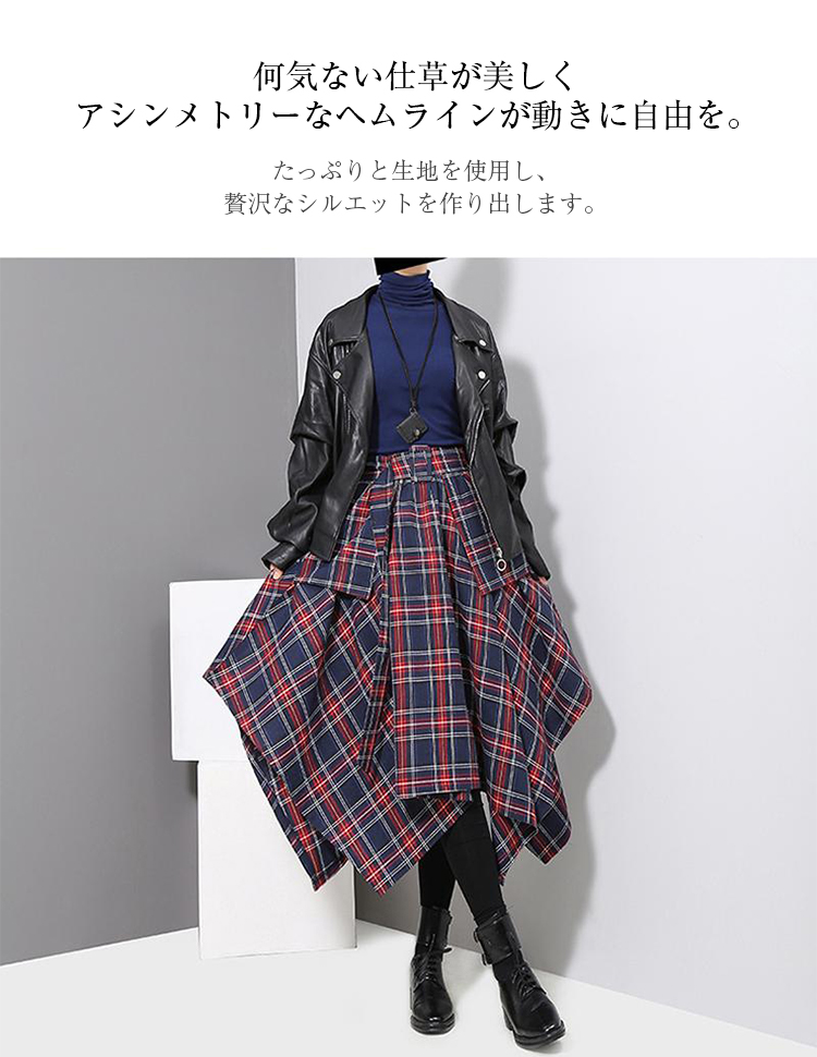 アシンメトリー スカート ロングスカート 裾変形デザインスカート レディース 春 夏 秋 冬スカート ミモレ丈 フレアスカート ボトムス チェック柄 ヘムライン ウエストゴム アレンジ 調節 ひざ下