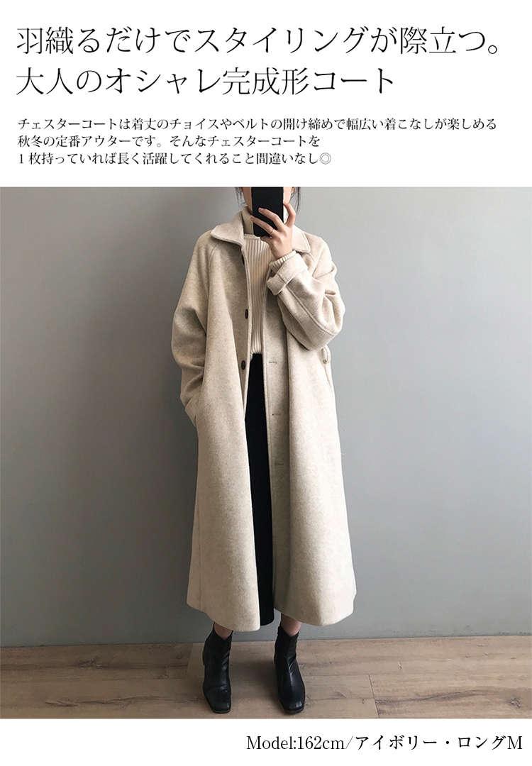 とらみ■商品名チェスターコート レディース 秋 冬 チェスターコート ロングコート 裏地付き アウター ジャケット 羽織 ロング丈 厚手 防寒 暖かい ゆったり 大きいサイズ ベルト付き おしゃれ コート きれいめ お洒落 上品 シンプル 大人 無地 送料無料■サイズ袖丈 胸囲 裾 着丈M 69cm 110cm 170cm 109cmL 70cm 114cm 174cm 110cm多少の誤差が生じる場合がございます。予めご了承下さいませ■関連商品当店のコート・ジャケット 商品一覧 当店の個性溢れるアイテム特集■洗濯表示■素材ポリエステル85% 綿15%なし■カラー■ベージュ、アイボリー画面上と実物では多少色具合が異なって見える場合もございます。ご了承ください。■商品説明秋冬のコーデ完成度を格上げすること間違いなし。ひらりと揺れるロングテーラードが登場!!
