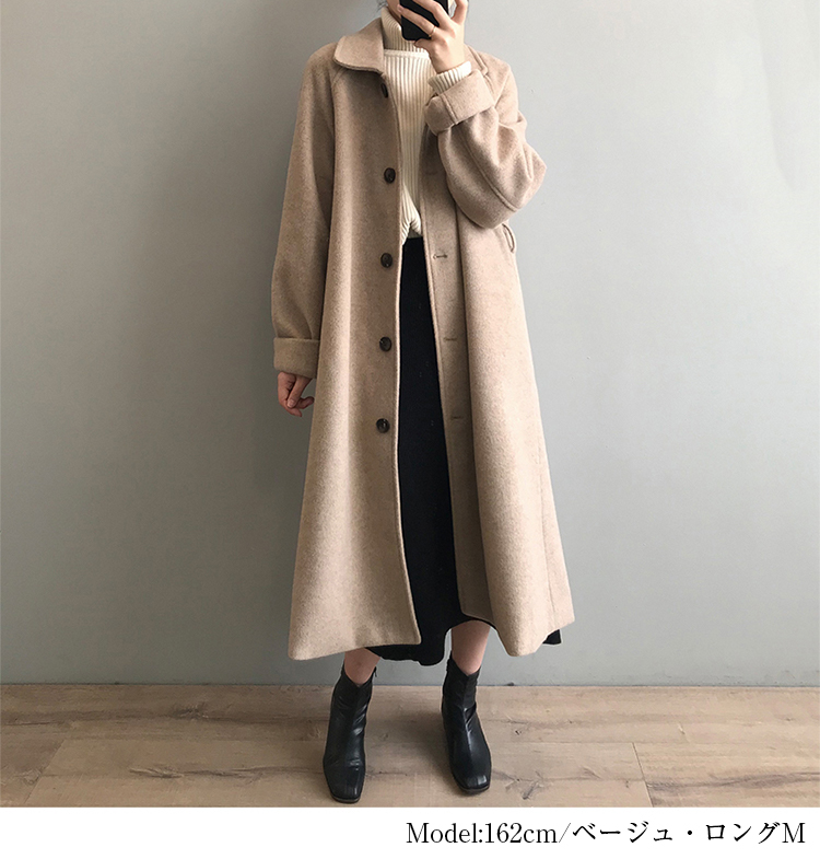 裾にかけてほどよく広がりのあるデザインになっているから、美しいシルエットを自然と作り出してくれるオーバーコートです。