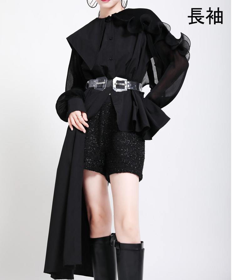 ケープデザインのアシンメトリーフリルカラーがアクセントのブラウス。