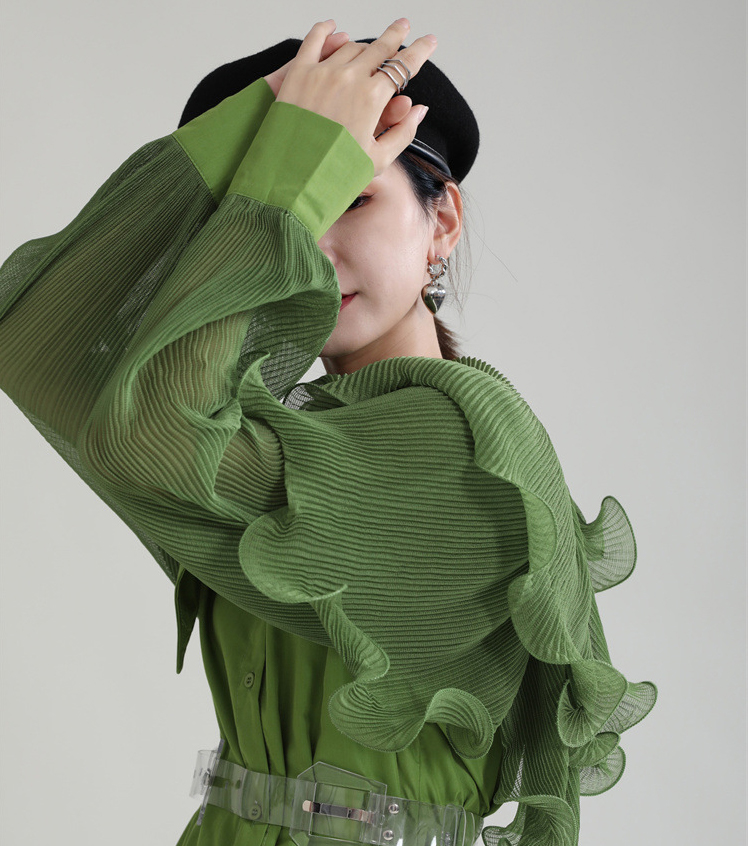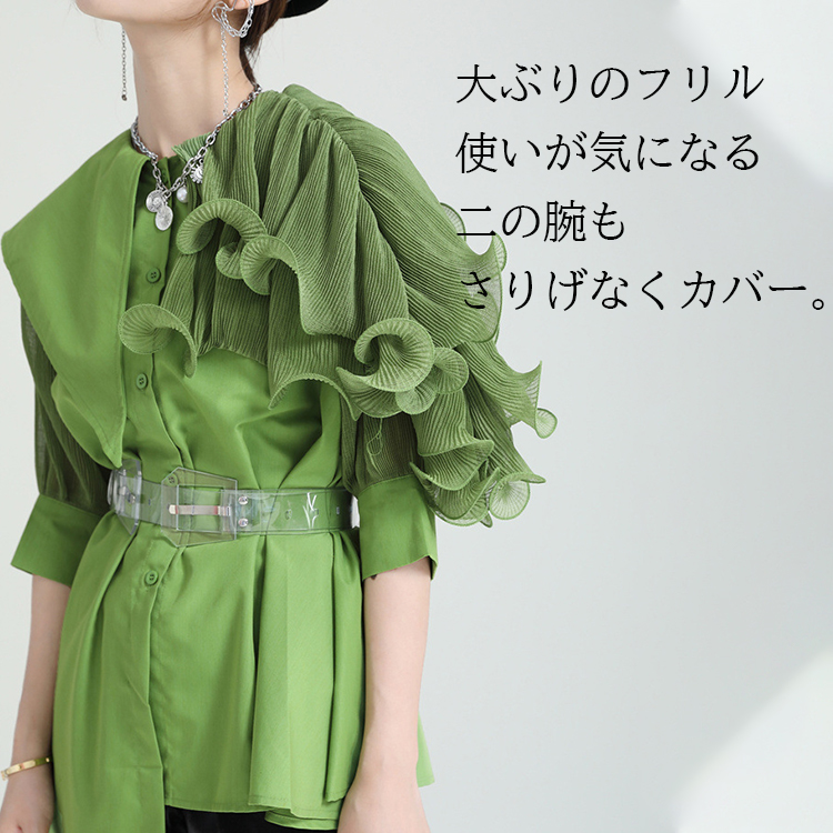 大ぶりのフリル使いが気になる二の腕もさりげなくカバー。