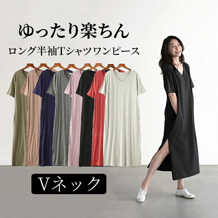 tシャツ ワンピース レディース 夏 半袖 Vネック tシャツワンピース ルームウェア ワンピース ロングワンピース スリット 柔らか 綺麗 通気性 吸湿速乾 部屋着 シンプル 敬老の日 プレゼント