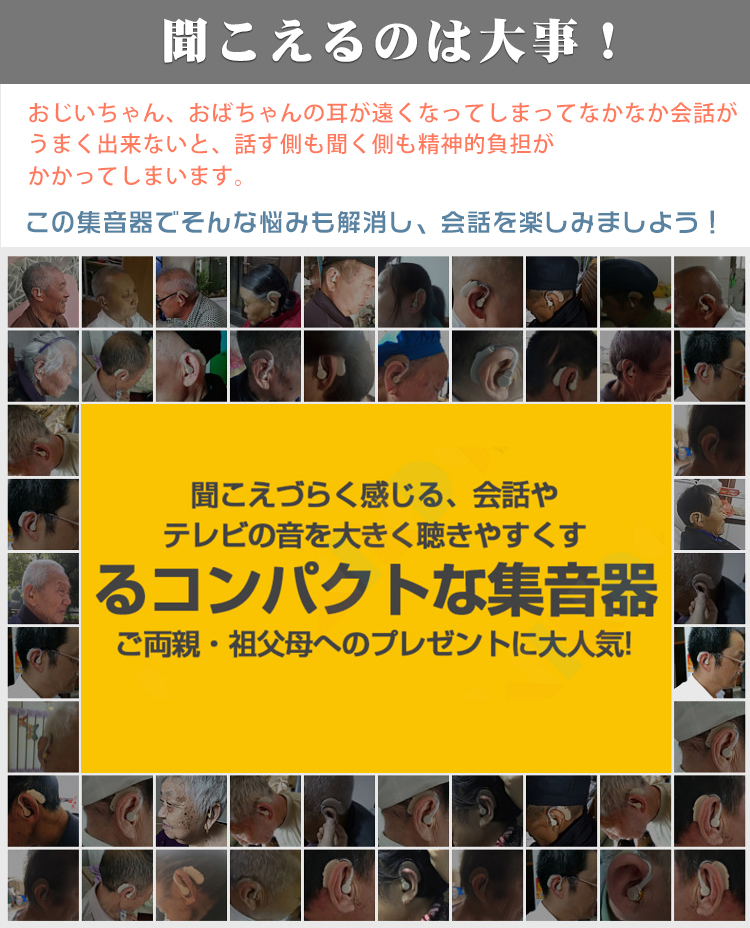 ● 本製品は音を集めて大きくする一般家電の集音器であり、聴覚障碍者の方向けの補聴器ではありません。補聴器は「聴力に合わせて足りない音を大きくするもの」です。集音器は「すべての音を大きくするもの」です。