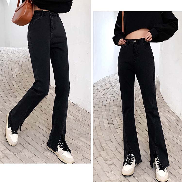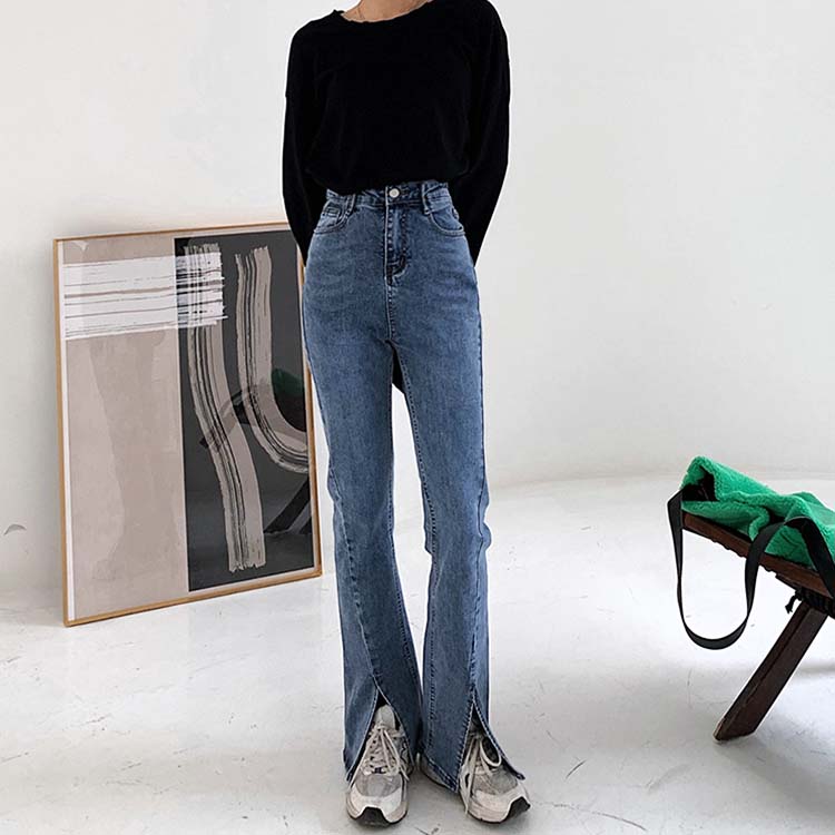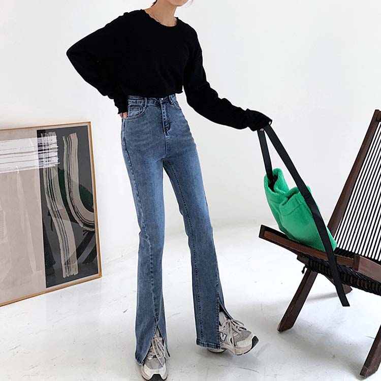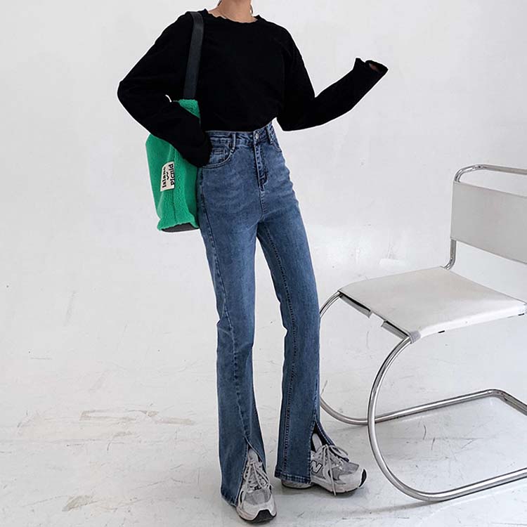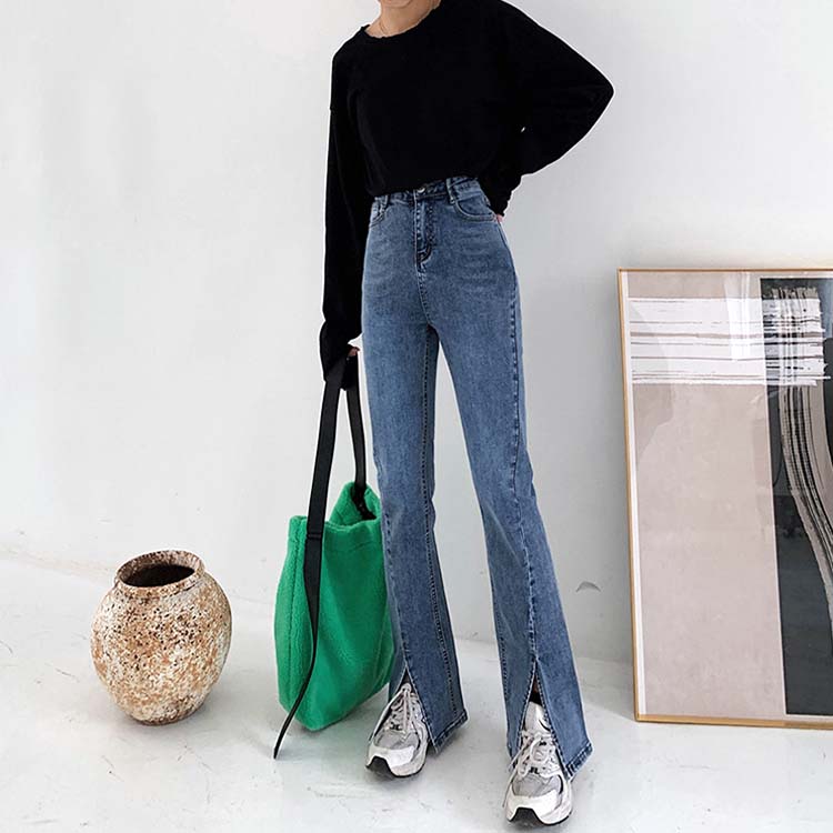 商品説明 韓国デザインのスリット入りフレアデニムパンツ。