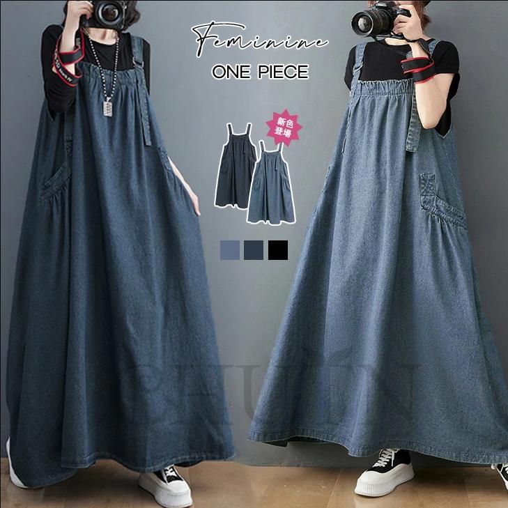 ジャンパースカート デニム デニムワンピース ロング マキシワンピース 春 秋 ロング丈 ジャンスカー サロペット 大きいサイズ デニムワンピ ポケット付き