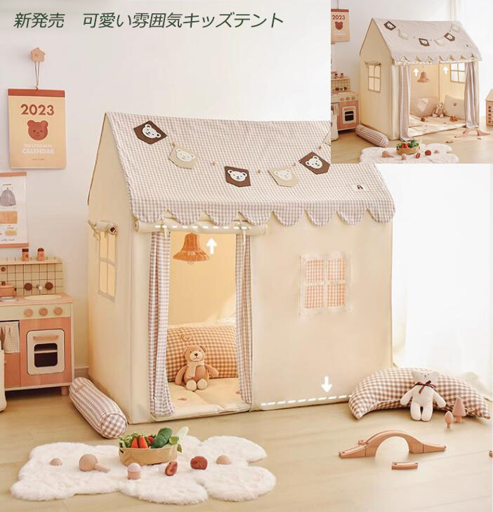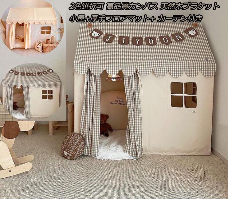 ベージュ 3点セット キッズテント 子供部屋 プレゼント 子供テント キッズ プレイテント カンバス 洗える 丸洗い 小屋+厚手フロアマット+ノレン黄色チェック柄 PVCブラケット 男女兼用
