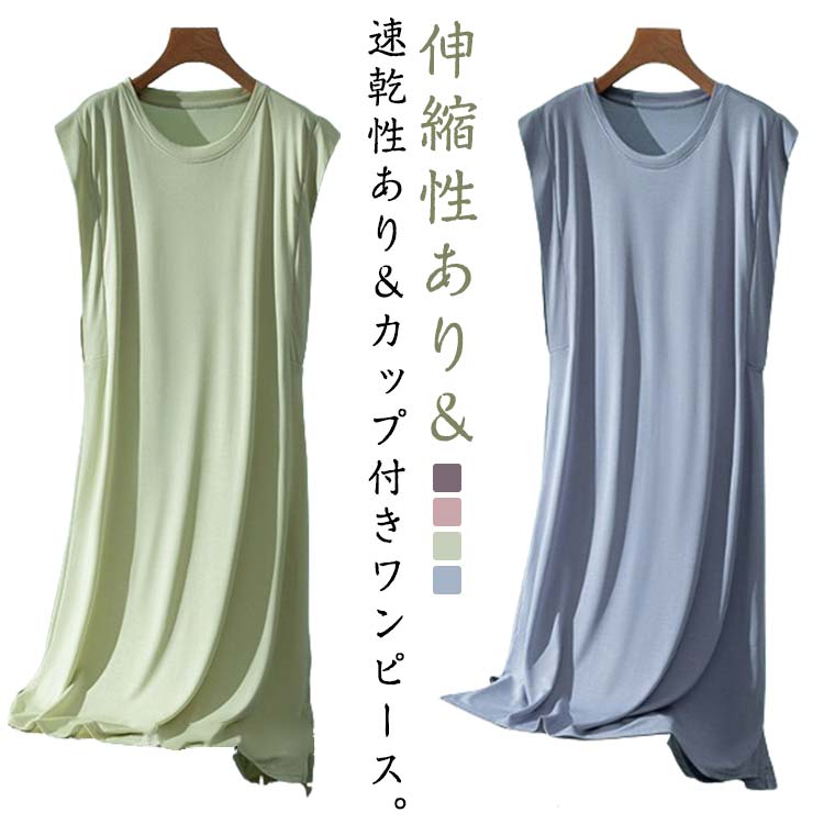 カップ付き モダール 部屋着 ルームウェア ワンピース ロングワンピ フレンチスリーブ 袖なし ワンピース パジャマ カップ付きワンピース ナイトウェア ゆったり リラックス ロングシャツワンピース