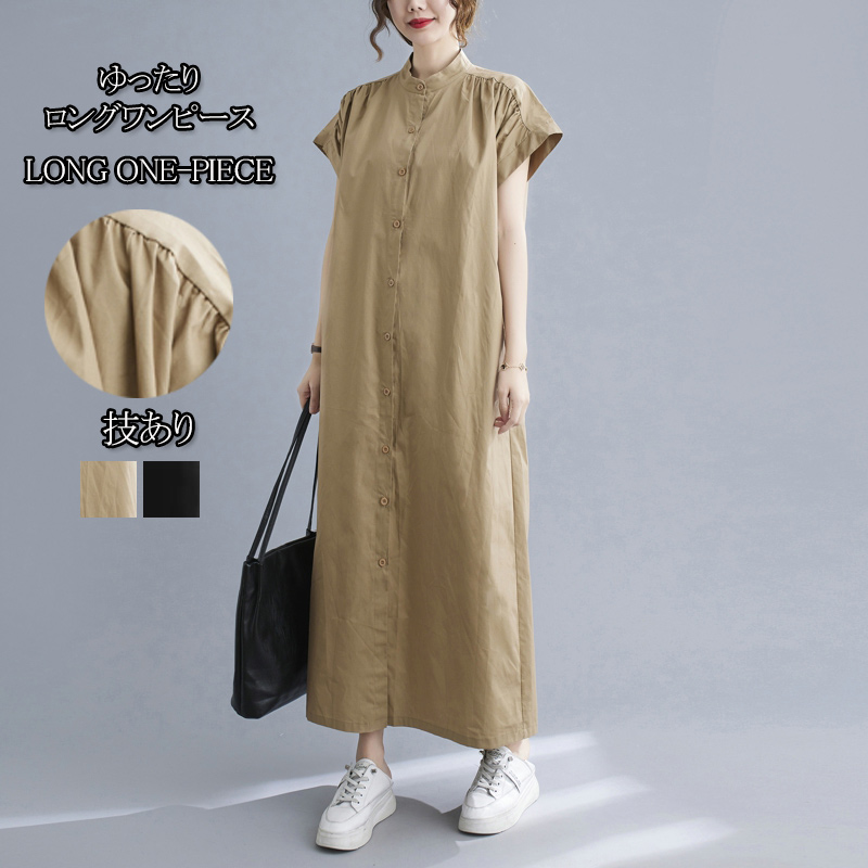 シャツワンピース 夏 黒ワンピース ロング ワンピース きれいめ ロングワンピース レディース 羽織 大きいサイズ バンドカラー ロング丈 マキシ丈 Aライン 30代 40代 ブラック