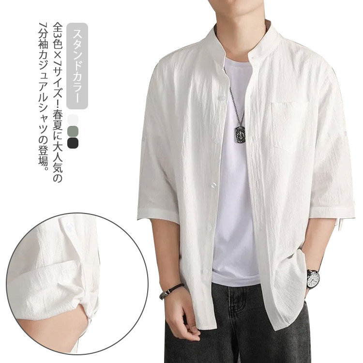 夏シャツ メンズ 麻 綿 カジュル 7分丈 カッコイイ ワイドシャツ ゆったり 夏コーデ 新作 サマー風 スタンドカラー 日常感 無地 ボタン 大きいサイズ 5 上品