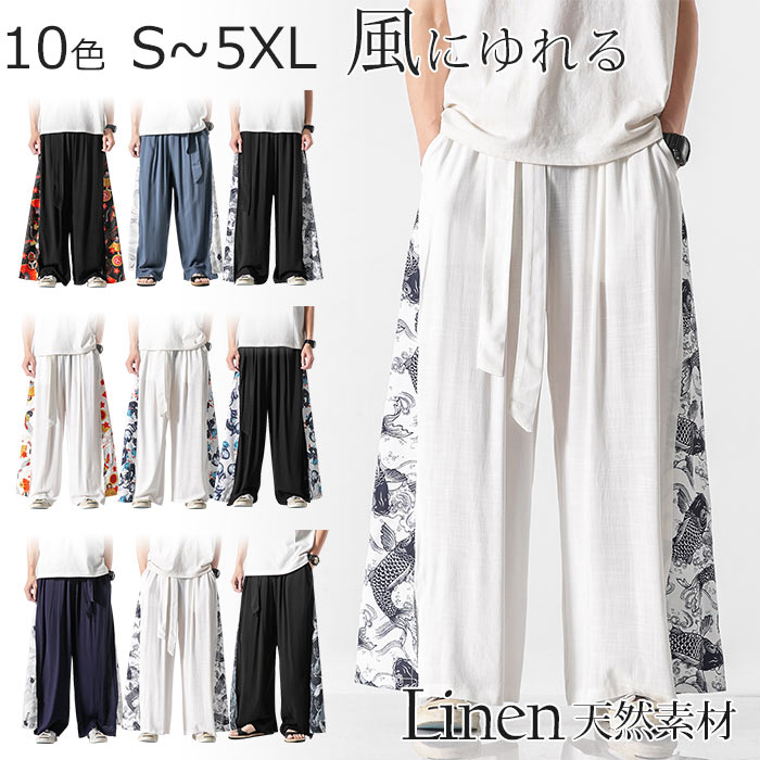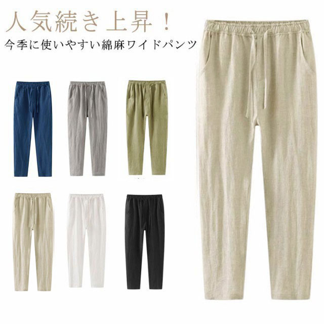 M~5XL 麻ワイドパンツ ロング丈 春夏 ウエストゴム 薄手メンズファッション ズボン パンツ