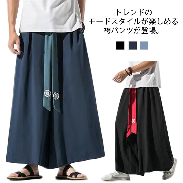 メンズ 刺繍 綿 ゆったり ロングパンツ スカンツ ガチョウパンツ モード 和柄 サルエルパンツ リラックス カジュアルパンツ 麻混 リネンパンツ 大きいサイズ ワイドパンツ ウエスト紐 タイパンツ