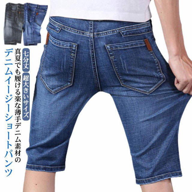 デニムハーフパンツ 伸縮性 パン 7分丈 スリム 細身 ブルー シンプル 7分丈メンズファッション ズボン パンツ