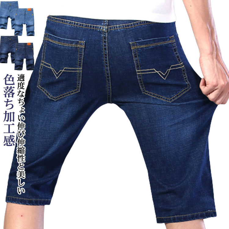 デニムハーフパンツ 伸縮性 Gパン 7分丈 スリム 細身 ブルー シンプル 7分丈メンズファッション ズボン パンツ