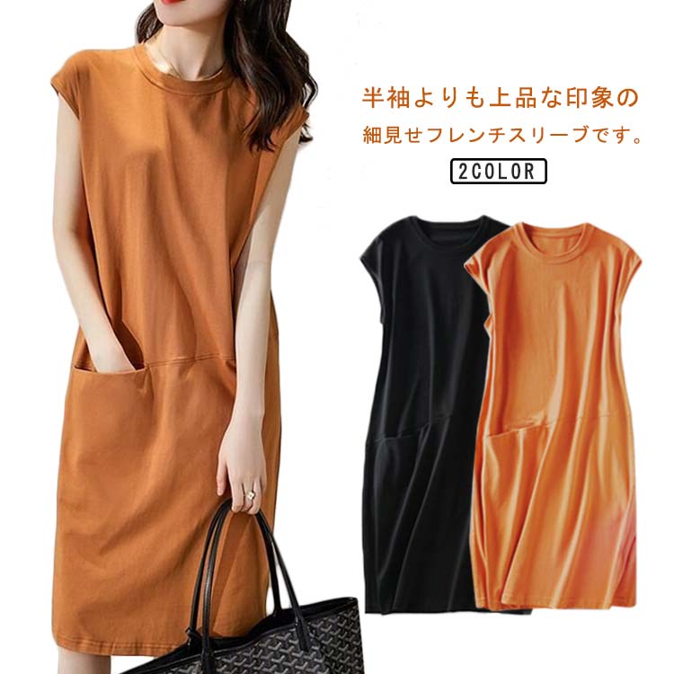 ひざ丈 レディース 春 きれいめ Tシャツ レディース 無地 フレンチスリーブ 夏 ラウンドネック 部屋着 ルームウエア リラックス シンプル ワンピース ノースリーブワンピース