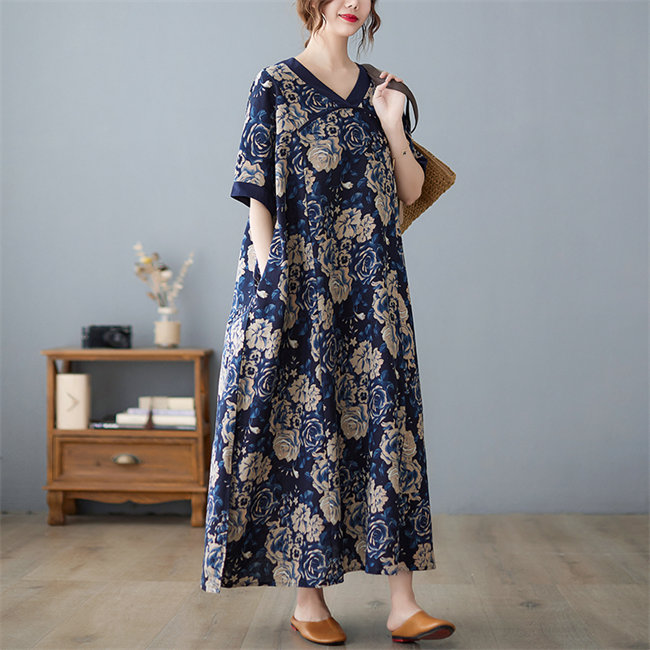 ネイビーレディースロングワンピース マキシ丈ロング丈カジュアル花柄プリント体型カバー 夏 半袖 綿 春 きれいめ 半袖 ロング vネック 春夏 薄手 ワンピース 柔らか シンプル 30代40代50代