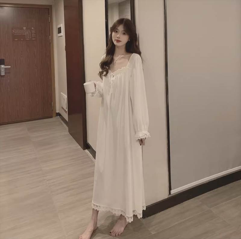 ネグリジェ 韓国 ナイトウェア ワンピース 冬 大人可愛い コーデ 30代 冬 韓国 トレンド レース 部屋着 寝巻き ナイトウェア ロングスカート ロング 袖あり 長袖 ボリューム袖