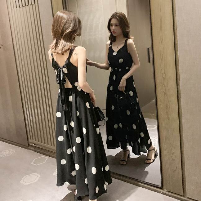 ワンピース レディース フレア 個性的 ロング アンクル丈 ドット 柄 リボン 黒 白 L XL 2XL 3XL 4XL 大きいサイズ 春 夏 秋 レトロ フェミニン ガーリー おしゃれ 背中見せ
