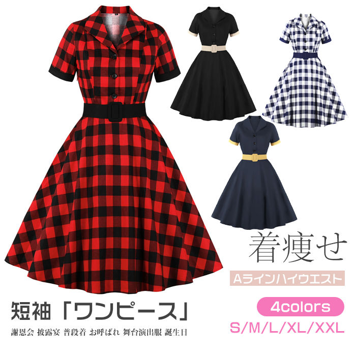 レディース 4色 S-2XL レトロワンピース チェック柄 結婚式 短袖 ロカビリー 着痩せ ハイウエスト