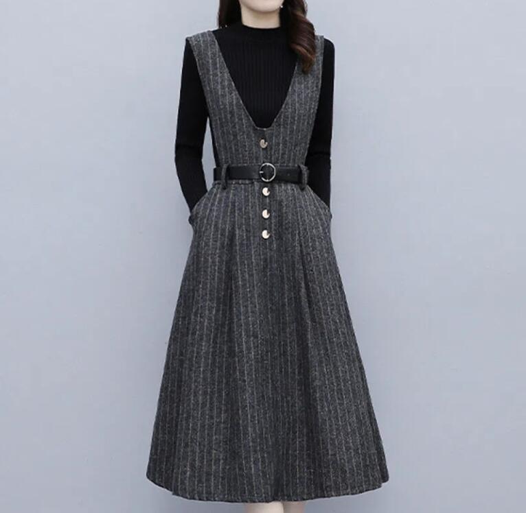 ワンピース Vネック ジャンパースカート ストライプ ノースリーブ フレアスカート レディース ロングワンピース ロング丈 春 秋 冬 シンプル カジュアル 大人