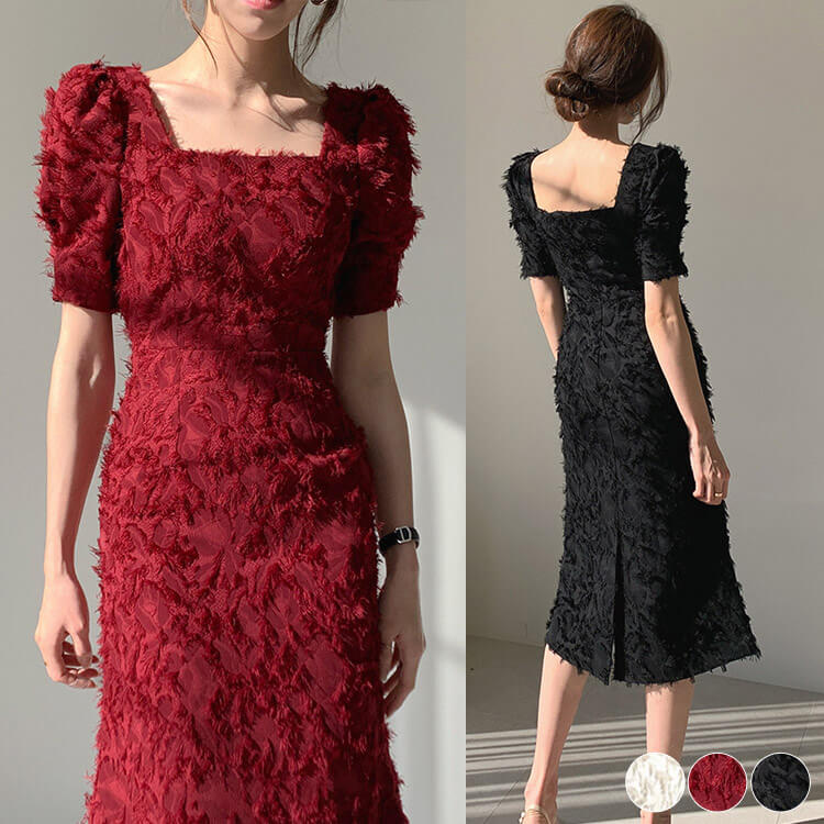 ドレス レディース パーティードレス 半袖 スクエアネック 膝丈 パフスリーブ 白 黒 韓国レディースファッション ドレス
