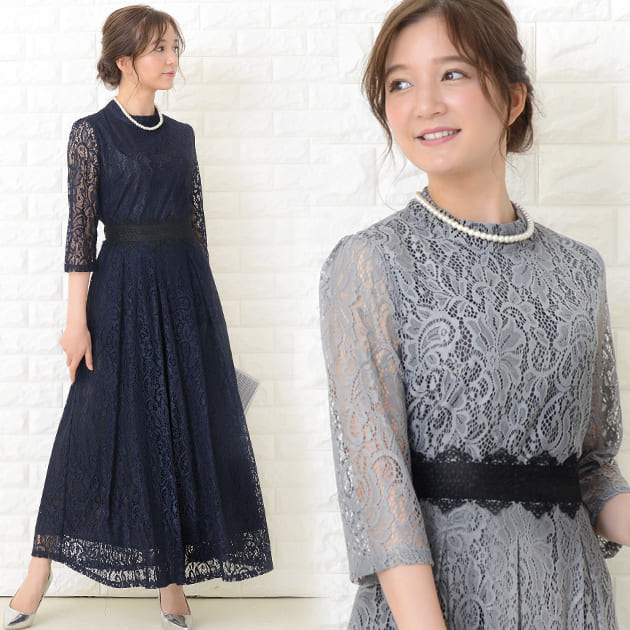 パーティードレス ロングワンピース 総レース シースルー袖 長袖 ロング丈 結婚式 披露宴 二次会 お呼ばれ ベージュ 黒 ブラック グレー ネイビー グリーン ミント ワインレッド20代 30代 4