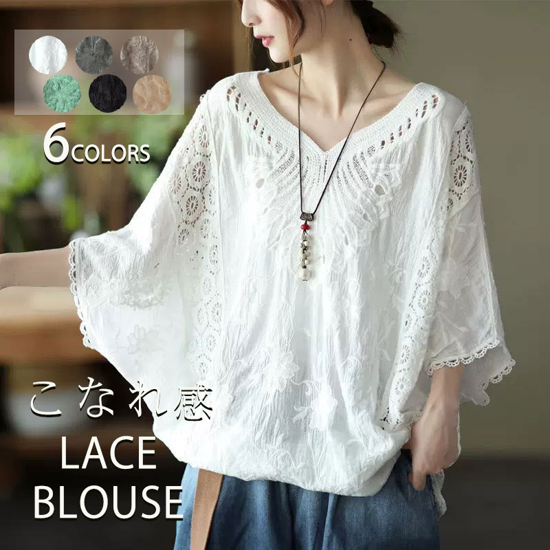 毎日違う インナーを変えるだけテンション変わるブラウス 柔らかく涼しいレースブラウス 可愛い 夏服 年齢にこだわりなく幅広く着られるレーストップス レース刺繍トップス 低身長