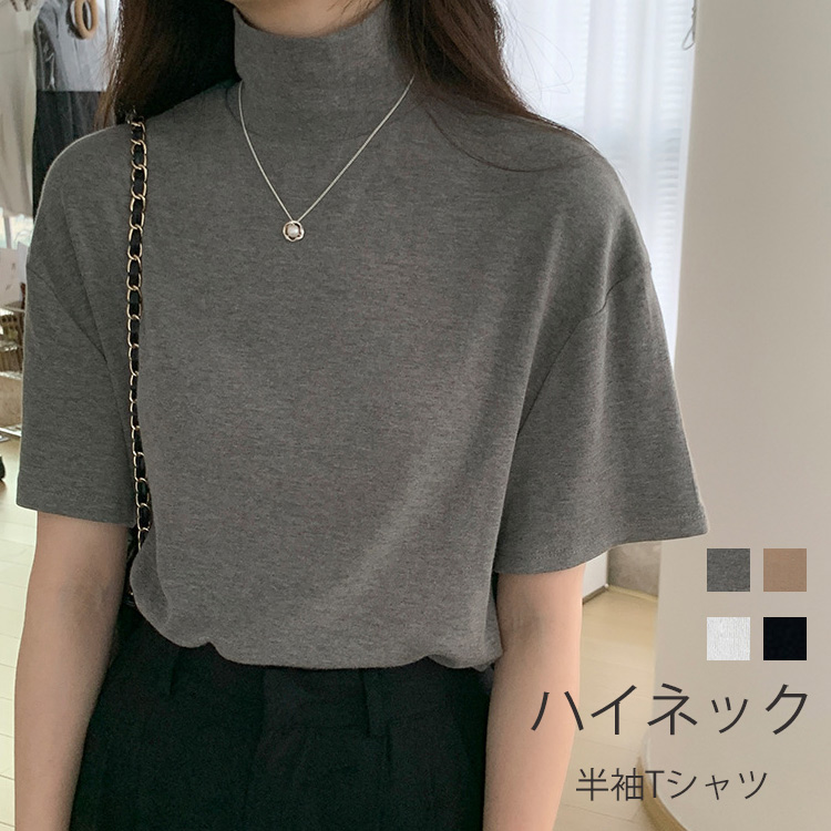 首もとをおしゃれに隠せるハイネック半袖tシャツ ダボっとしたゆったりシルエット、伸縮性のある生地、着心地抜群 二の腕カバーできる長め半袖tシャツ ベーシック4カラー選べる