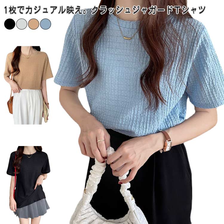 Tシャツ レディース クルーネック 半袖 コンパクト トップス シワ加工 カットソー プルオーバー おしゃれ クラッシュジャガード