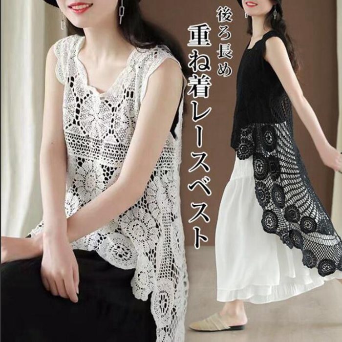 レース ベスト ノースリーブ 花柄 刺繍 後ろ長め 重ね着 不規則 ニット ジレ トップス 羽織り ロングベスト 総柄 透かし編み 個性的 タンクトップ レディース ゆったり コーデ 着痩せ