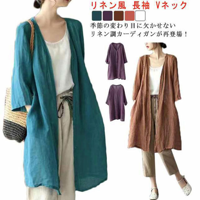 ロングカーディガン くすみカラーカーディガン薄手 ニュアンスカラー 麻素材 長袖 七分袖カーディガン 軽い肩掛け UV対策 冷房対策 レディース 9色 4サイズ S M L XL