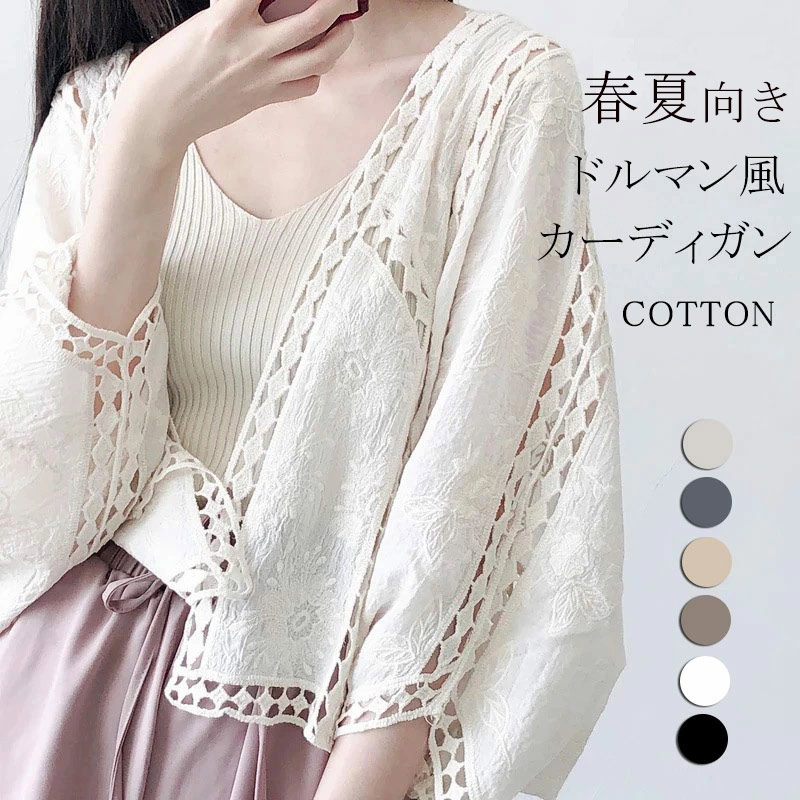 夏カーディガン レースカーディガン 透け感が涼しげなボレロ カーディガン サマーカーディガン コットン生地 レース 羽織り ショート丈 無地 7分袖 ドルマン UV対策 春 夏