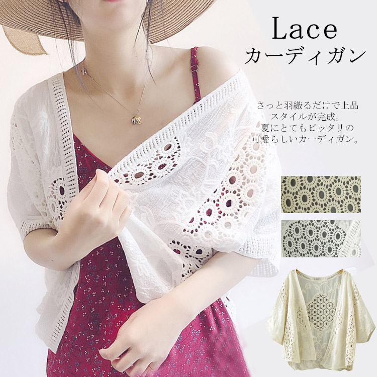 ☆パール付き 薄手カーディガン春夏向き ☆エレガンスな贅沢カットワークレースで大人の魅力をアップ レディースファッション トップス カーディガン ボレロ
