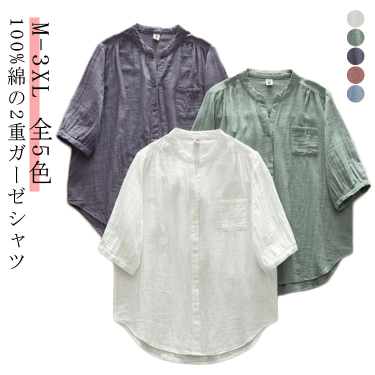 100%綿 吸湿 速乾性に優れ、通気性も良いガーゼ生地 長袖シャツ 5分袖シャツ シャツ 前開き 五分袖シャツ 丸首 シンプル カジュアル 無地シャツ 白 ホワイト ルームウェア シャツ