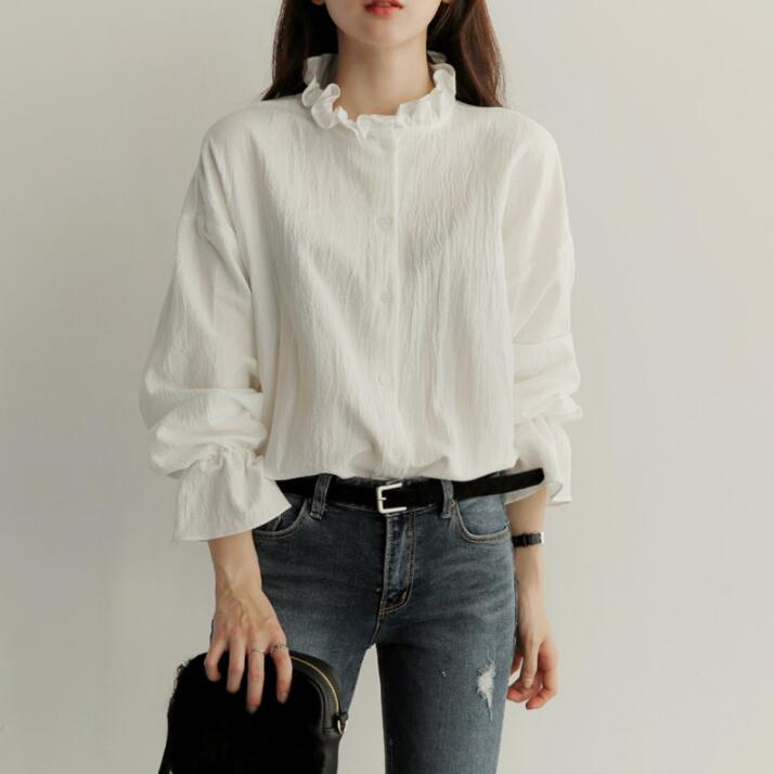 レディースフリルブラウスコットンシャツフリルボリューム袖 長袖 トップス立ち襟パフスリープ入学式 卒業式 入園式 卒園式 春 秋オフィス 通勤通勤服ビジネスゆったり小さいサイズ大きいサイズホワイト