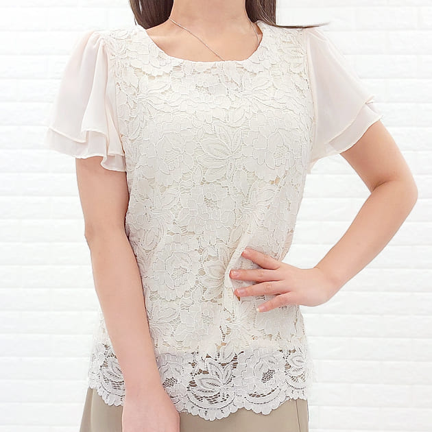 シフォン レース ブラウス 半袖 レディース オフィス カジュアル 春 夏 フレア袖 結婚式 お呼ばれ 通勤 きれいめホワイト 白 ブラック 黒 グレー ネイビー 花柄 フォーマル 丸襟 トップ