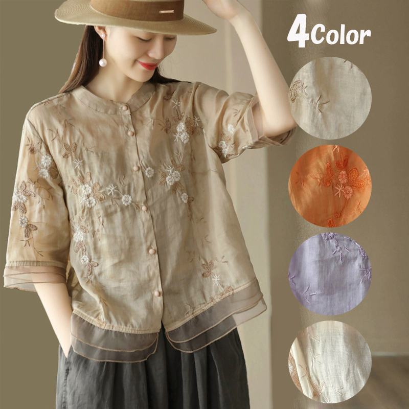 真夏もサラッとした肌触りの 刺繍が素敵なプチアジアンエスニックトップス 半袖 ブラウス 刺繍 トップス フリーサイズ