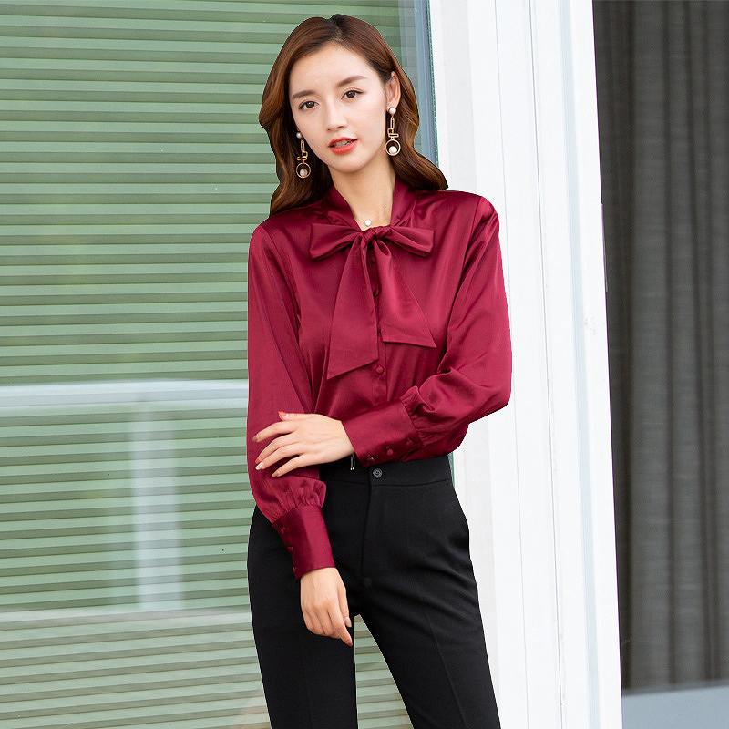 レディース ブラウス 首元リボン ロングシャツ トップス カジュアル キュート フェミニン オフコーデ OFF 大人可愛い お出かけ服 デート ホワイト ワインレッド ブラック