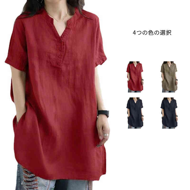 半袖 シャツ ロングシャツ トップス vネック 膝丈 チュニックワンピース 夏 薄手 リネン 涼しい シャツ