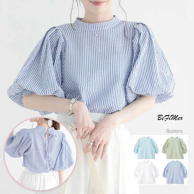 トップス ブラウス 白トップス 袖あり 半袖 5分袖 ボリューム袖 パフスリーブ ラウンドネック クルーネック 大人可愛い シンプル カジュアル おしゃれ ラブリー キュート ガーリー 主役級