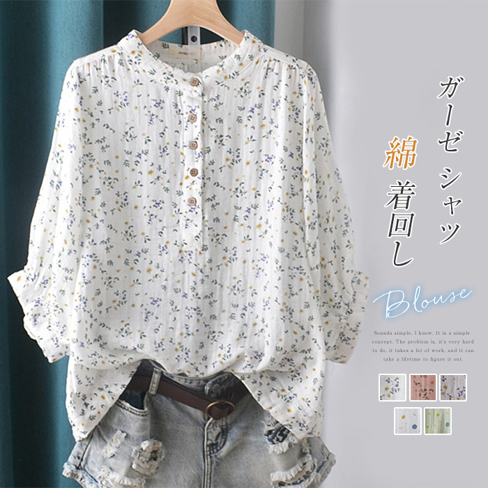 販促 ガーゼ シャツ ガーゼシャツ レディース ブラウス 七分袖 スタンドカラー シャツ 綿シャツ コットン 開襟 前開き 大きいサイズ