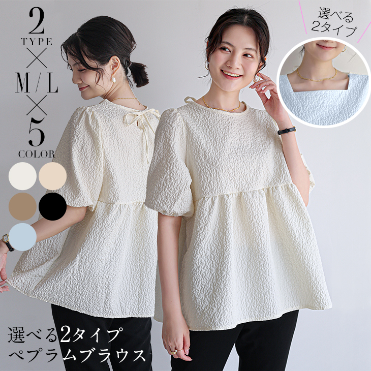 選べる2タイプ ペプラムブラウス ラウンドネック スクエアネック レディーストップス 半袖 五分袖 パフスリーブ 切り替え 柔らかい フェミニン 膨れ素材 シワ加工 ポコポコ