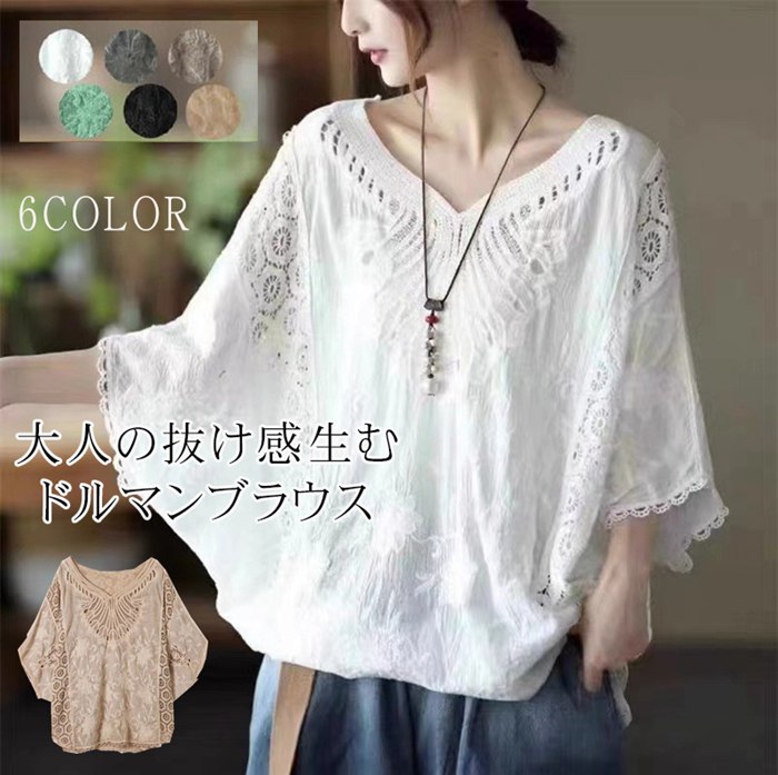 ブラウス レディース トップス レース 夏 vネック フェミニン 柔らか ワイド 体型カバー ファッション 韓国 大人 通勤 カジュアル
